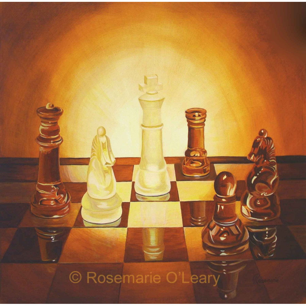 This still life painting came about from playing with lights and glass chess pieces while exploring human relationships. The check mate pieces and their positions mean different things to different people. Art speaks to the viewer.